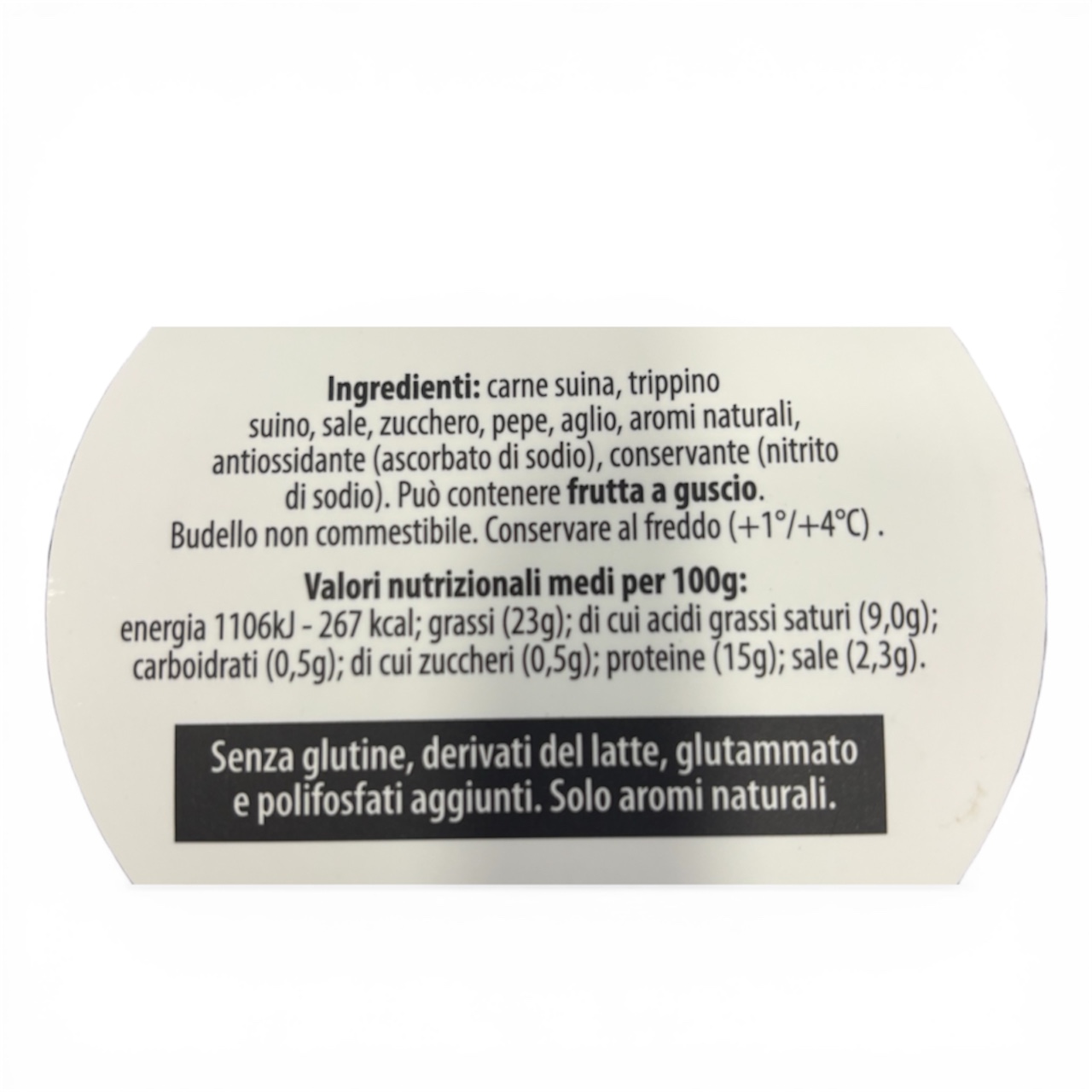 Carne suina, trippino suino, sale, zucchero, pepe, aglio, aromi naturali, antiossidante (ascorbato di sodio), conservante (nitrito di sodio).